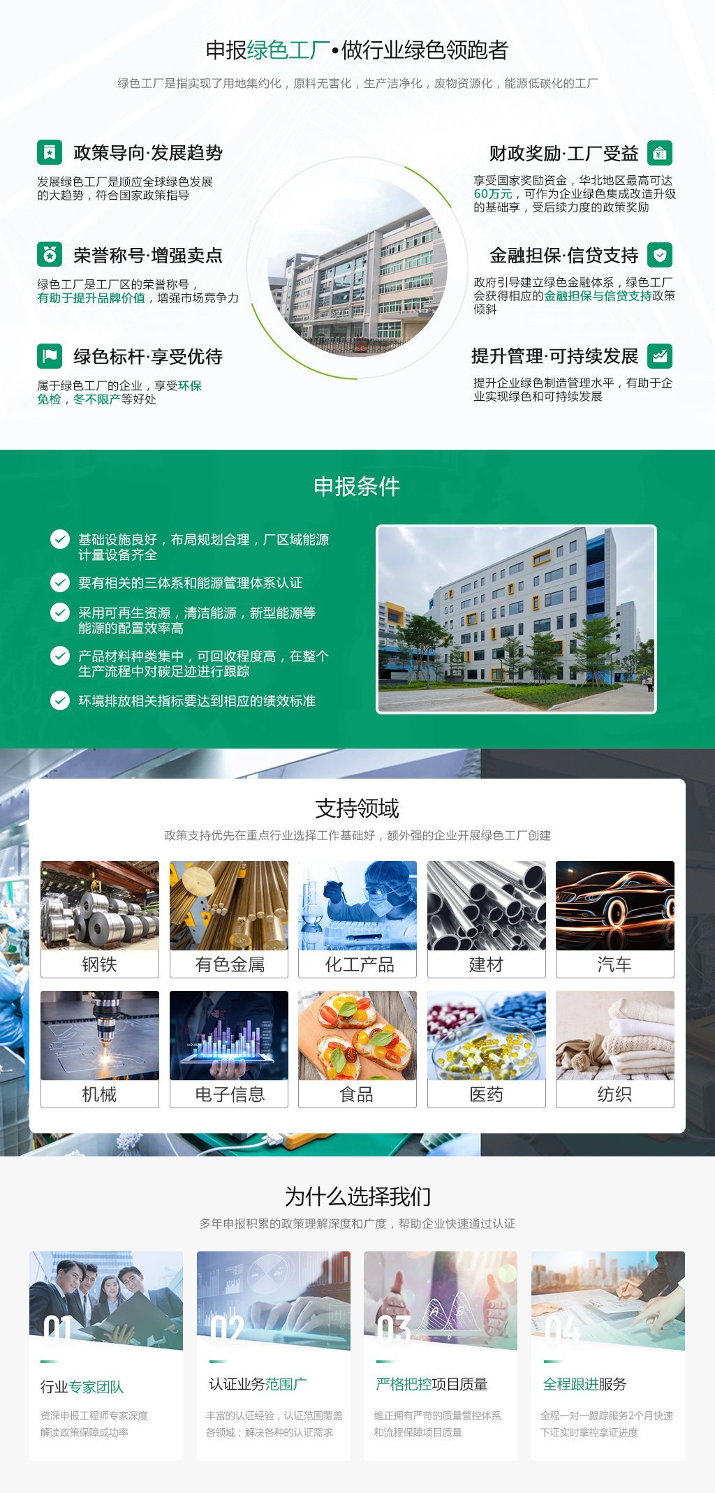 优先在钢铁、有色金属、化工、建材、机械、汽车、轻工、食品、纺织、医药、电子信息等重点行业选择一批工作基础好、代表性强的企业开展绿色工厂创建。通过采用绿色建筑技术建设改造厂房,预留可再生能源应用场所和设计负荷,合理布局厂区内能量流、物质流路径,推广绿色设计和绿色采购,开发生产绿色产品,采用先进适用的清洁生产工艺技术和××末端治理装备,淘汰落后设备,建立资源回收循环利用机制,推动用能结构优化,实现工厂的绿色发展。