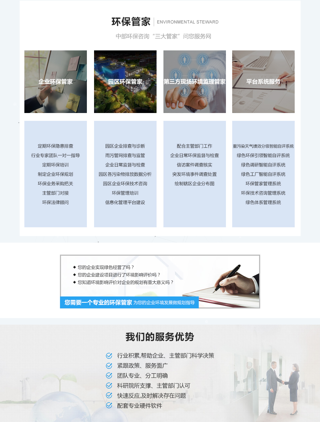 所谓“环保管家”,就是一种“合同环境服务”, 主要指环保服务企业为政府、为企业、为园区提供合同式综合环保服务,环保管家”通过常态化的“体检”和“问诊”,及时提出预警和针对性措施,以此避免环境事故的发生,让专业的人做专业的事。 在环保越来越严的形势下,环保能力也是企业生存发展的必备能力。作为专业的“环保管家”,对企业环保问题“望闻问切”,对环保疑难杂症进行“科学会诊”,既能找准污染治理主要环节和风险隐患突出问题,图文并茂形成“体检报告”,也能开出诊治“药方”,既能有效降低企业治污成本,也能有效提升企业治污能力
